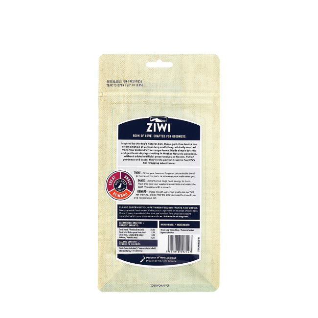 Inspired by the dog's natural diet, these guilt-free treats are a combination of venison lung and kidney, ethically sourced from New Zealand's free-range farms. Made simply by slow and gentle air-drying - locking in Mother Nature's goodness, without added artificial preservatives or flavours. Full of goodness and taste, they're the perfect treat to fuel life's tail-wagging adventures.