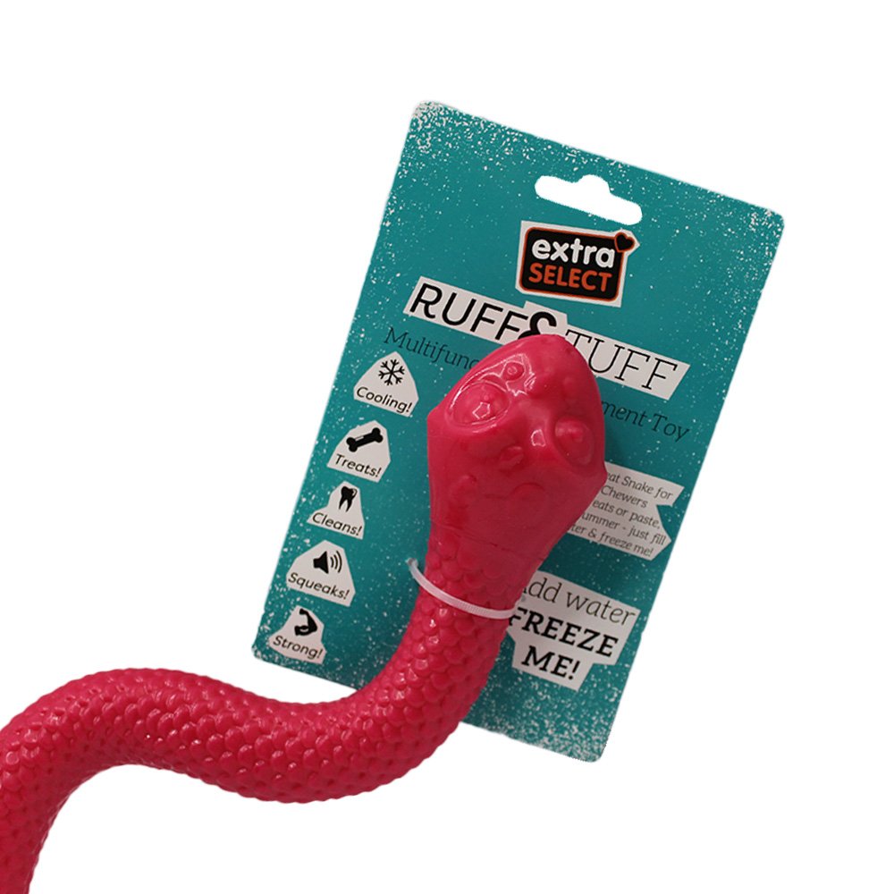 Squeaky treat snake for heavy chewers. Fill with treats or paste. Great for summer - just fill with water and freeze.